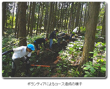 日本の山林は細かく所有者が分かれていて、2キロのコースを造るのにも6名の山林所有者の方の賛同が必要でした。途中、なかなか話が進まないこともありましたが、受付業務を委託するキャンプ場において何度も説明会を行いました。そして岡崎森林組合のみなさんや、26ismの理念に共感したファンの方達がボランティアとして造成に協力くださり、2010年8月、岡崎市くらがり渓谷キャンプ場そばの山林地にて第1号コースをオープンすることができたのです。