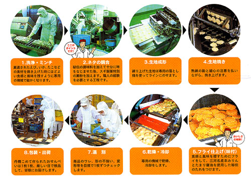 それは「たこ」で有名な三原市で饅頭を売る店。オーダーは「たこせんべい」、月に200万円ほどのオーダーがあった。この店に限っての「包装しないバラバラのままの発送」に興味を持った社長は三原へ飛んだ。その取引先では、たこせんべいを自社のせんべいとして売るべく、2枚ずつ手で詰めて自社ブランドの包装をし、ホッチキス留めをしていた。聞けば「三原のたこせんべい」というイメージから売れ行きがよく、手詰めでは間に合わずバックオーダーを抱えているとのこと。それならばと、社長は包装まで自社で行い三原へ出荷するいわばOEM生産することを提案。その結果、この商品は一気に月1,400万円の売上へと成長した。当社も卸を通さないため利益率を確保することができた。卸ルートに頼らず、顧客とともに商品を育てるビジネスモデルを発見した瞬間である。 |