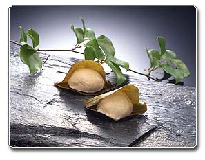 餡麩三喜羅はもちもちとした食感の生麩としっかりと熱を通した小豆で丁寧につくられたこし餡の組み合わせによる上品な味わいが特徴。さらに本体を塩漬けされた三帰来(別名サルトリイバラ)で包むことで、葉の香りと塩味が加わる、味わい深い生和菓子である。