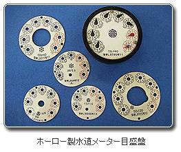 但し、当社で開発した水道メーター用ホーロー製目盛盤は鉄板ではなく銅板を使用したもので通常のホーローに七宝焼きを融合させた様なものである。