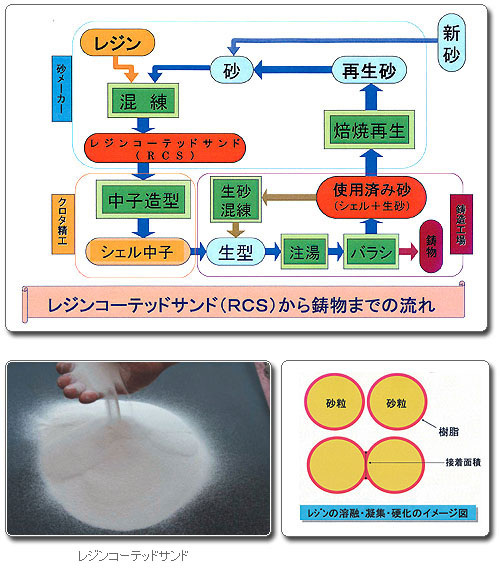 当社では鋳物用中子を「シェルモールド法」と呼ばれる方法で製造している。これは、砂をフェノール樹脂でコーティングした「レジンコーテッドサンド」で成型する方法である。300℃前後に暖められた型の中へ、樹脂コーティングされた砂をエアブローで吹き込む。すると、暖められた型に接触した部分では樹脂同士が固まり、鋳物用中子ができあがる。現社長の鈴木輝彦氏曰く「タイヤキを作るようなイメージ」とのこと。