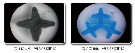 従来のブラシは硬く、断面は【図1】のような十字型をしていたため、保水性に乏しくブラシの先端がとがった状態になり、汚れが落ちなかったり、キズをつけたりしてしまっていた。そこで、【図2】のように十字形を3つ組み合わせた形状に改良、ブラシ材も高発泡素材にすることで、保水力を30%アップさせ、キズのつきにくい洗車ブラシを完成させた。