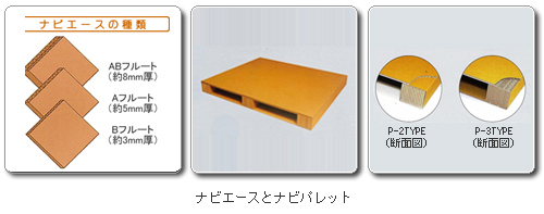 昭和52年には「ナビエース」を使用したダンボール製パレット「ナビパレット」を開発、販売を開始する。ダンボールパレットはリサイクルできる他、木製パレットに比べメリットがある。木製パレットで輸出しようとする場合、燻蒸処理(くんじょうしょり)又は熱処理をし、材木についた寄生虫を殺して使用(輸出)しなければならないが、ダンボールパレットであればその処理が不要。また、木製パレットは含水量が40%ほどあり、輸送中にコンテナ内で水分が蒸発、結露するという現象が発生してしまうが、ダンボールパレットは含水率が9%と結露も発生しづらいという優位性を持つ。こうした優位性が評判となり、また改良を重ねることにより、ナビパレットは現在までに1千万枚の出荷を記録、業界トップの実績となった。