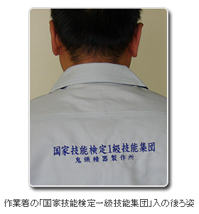 中小企業でこれほどの割合で数値制御フライス盤や円筒研削盤、平面研削盤、機械検査等幅広い分野の1級技能士を擁するのはあまり例がない。