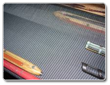 ションヘル織機では1日10数メートル、高密度の織物の場合では8mほどしか織れない。