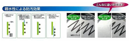 その塗料は非常に強い親水性を持つ無機塗料であった。親水性が非常に高いため、例えば油性マジックで塗装面に落書きをしても、水をかけることできれいに落ちてしまう。これは、油性マジックと塗装面との間に「より仲の良い」水が入り込むことで、油性マジックが剥がれて流れ落ちるためである。こうした親水性による防汚効果の他、10円玉でこすっても傷がつかないほどの耐摩耗性、500度までの耐熱性、抗菌・抗カビ効果など、抜群の機能性を持つ。