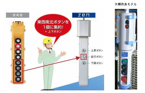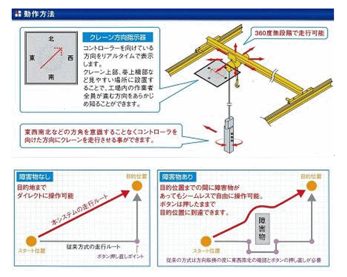 従来のように東西南北の方角を考えながらボタンを押さなくとも、進行方向へコントローラーを向け、たった一つの走行ボタンを押すだけでクレーンを進めることができるようになるため、ボタンの誤操作や方角認識ミスを防ぐことができる。さらに、オペレーターがコントローラーと共に進行方向を見ながら操作ができるので、障害物に衝突する事故も起きにくくなる。従来できなかった斜め走行も可能となり効率化の向上にもつながる。新設の天井クレーンはもとより、既設のクレーンの取り替えも可能なため、日本全国の天井クレーンを使うユーザーが顧客となる。