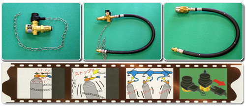 地震などによりLPガスのボンベが転倒するとガス管が外れガス放出してしまう。このナマズバルブをボンベに取り付け、ピンとクサリで壁に固定する。振動等で転倒すると同時に、固定したピンがバルブから外れてガスを遮断する。特許も取得した当社初の自信の自社ブランド商品である。