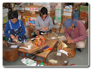 扇子の生産工程は大きく分けて、扇骨作り→扇面作り→絵付け→折り加工→仕上加工と5段階に分かれ、その各段階も多くの職人の手を経る。これらは、当社のような製造卸がすべての材料を仕入れ、各工程の加工を行う職人へ下請けに出す分業体制である。 「扇骨作りは、今では機械で粗削りをし、その後職人が専用の工具で仕上げを行ない、最後に扇子を開く中心になる『要打ち』を行います。扇面作りは骨を差し込む袋状の芯紙を裏表2枚の皮紙で挟んで糊付けをし、型抜きをします。次に絵付けでは地紙に絵を描きます。今では様々な加飾法や印刷法がでてきましたが、手書きの風合いを好まれるお客様も根強くおられます。その後、折り加工で骨の本数に合わせて正確に幅を折ります。ここで失敗すると扇子を閉じたときに不揃いになり、商品になりません。そして最後に扇面と扇骨を合体させる仕上工程です。扇面の芯紙の袋状になった部分に息を吹きかけ穴を開いて扇骨を差込み、製品になります。このように、それぞれ分業化した職人が、専用の工具を使い手作業で加工していきます。」