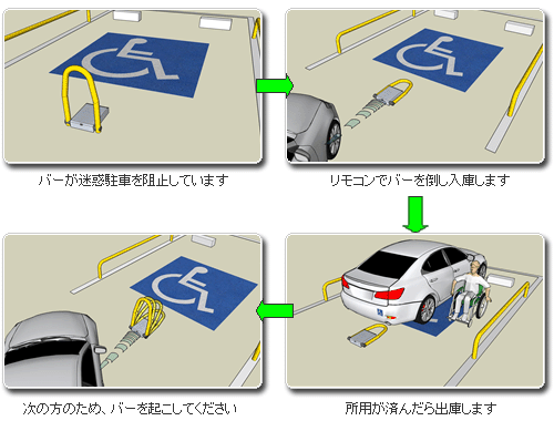 ショッピングセンターでは身障者手帳を本人が持参した際にリモコンをデポジット(預かり金制度)で貸し出し、利用者は駐車する際にこのリモコンを作動することで車止めバーを下げて所定のスペースに駐車することができる。リモコンの利用回数は一定のリミットが設定されており、リミットが近づいた段階で、引き続き利用したければ、再度ショッピングセンターで身障者手帳を確認の上、再び使用可能回数をリセットしてもらう。このようなリモコンの不正使用も防止可能な仕組みも準備している。