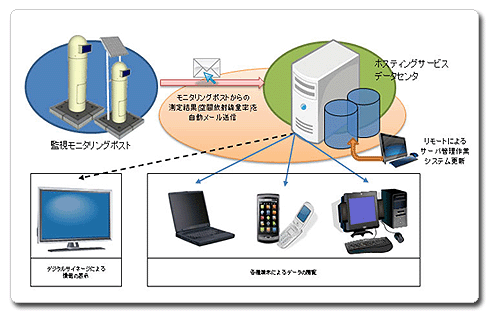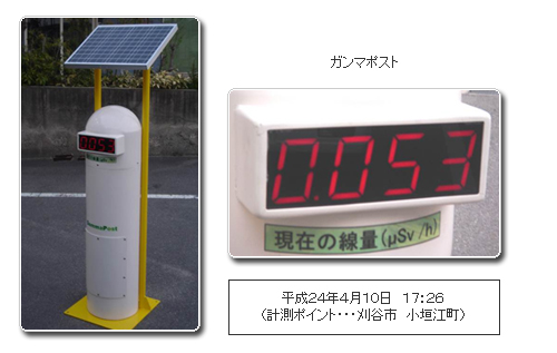 | 今年3月に開催された「とよたビジネスフェア」では、両社で共同開発した放射能測定装置「ガンマポスト」を展示・発表した。設置タイプで、放射能を連続的に定点観測することが可能である。測定値を表示画面が一体となっており、その場で放射線量を見ることができる。電源は100V型の他、太陽電池型も用意しており、電源が確保しにくい場所で設置しても計測が可能である。計測結果は表示画面のLEDで表示される他、自動的にサーバーへ送信されるためデータ蓄積やスマートフォンへの転送も可能。一旦設置すれば無人でデータ転送がされるので、従来のように線量計を持ち歩き計測した後データ入力するという手間もなくなる。