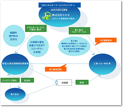 2005年には、50kw以上の高圧受電をしている事業者も、一般の事業者が発電する電力【新電力:PPS】から購入できるようになり、電力量の6割程度が自由化されたとされる。こうした新電力の供給者と高圧受電をする一般企業をつなぎ、併せて省エネ提案を行うのが株式会社ヒロセである。