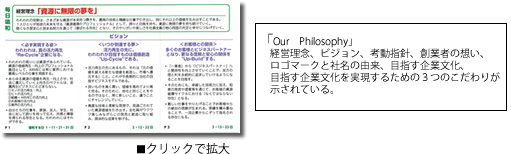 当社では2015年8月より「経営品質」の取り組みをスタートさせ、「顧客本位」「従業員重視」「社会との調和」「独自能力」の4つの柱を重視して企業運営を行ってきた。全社員で経営品質の学びを深めていく中で、2005年策定の経営理念を更に発展させ、100年企業を見据えた新たな理念を作りたいという意見があり、2016年5月から8月にかけて新理念策定プロジェクトを行った。 新理念と言っても全く新たに作り出したのではなく、当社がこれまで積み重ねてきた「良い考え」「良い習慣」「良い行動」を大切にしつつ、未来のより強い組織、強い個人、安定した業績の実現に向けた羅針盤として、社内で用いられてきたキーワードを丁寧に掘り起こし、磨きを掛け、再構築したものである。策定には各部門長が主体的に関わることで「社員一人ひとりが共感できる理念」を目指した。 完成時には全社員に向けて発表会を行い、その後も毎日の朝礼で唱和を行うなど、理念の浸透と実践に向けた取り組みを継続して行っている。経営理念・ビジョン・考動指針・目指す企業文化などは「Our Philosophy」というリーフレットにまとめられ、全社員が常に携帯している。社名の由来や創業者の想いも掲載し、原点を忘れないようにしている。
