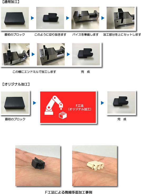 このころ現会長(当時の社長)の克己氏と工場長とが「F工法」と名付けられたマシニングセンターを活用した独自の加工技術を開発。通常は治具で何度も固定し直しながら加工するところを、治具が不要で通常の後工程を大幅に減らせ、しかも、立部が1mm以下の肉薄加工などでも精度が確保できる工法。加工の工程数を減らすことでコストや納期を削減することに成功した。