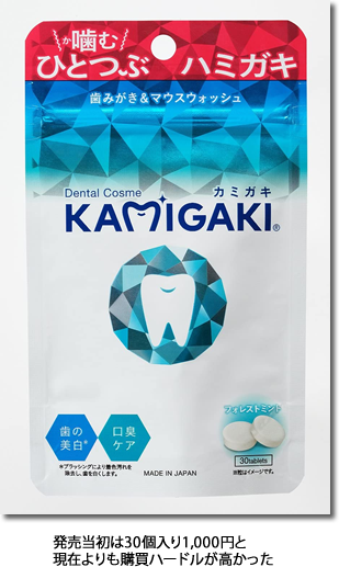 2018年4月、商品名も「噛む歯磨き」をイメージさせる「KAMIGAKI」として1パック30個入りを1,000円で販売開始。