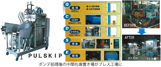 こうして一般車への採用も次々決まる中、どうしても気になる生産工程があった。鍛造加工時に金型との摩擦を減らし焼き付きを防ぐ潤滑皮膜を形成する「ボンデ処理」と呼ばれる工程。脱脂・酸洗・化成(リン酸塩皮膜形成)・中和・石鹸皮膜形成の工程の間に何度も水洗いを重ね9工程を経た後、充分に乾燥させることが必要となる。化成設備や廃水処理設備も必要で大量のバッチ処理となる。他の工程は必要なものを必要なときに必要なだけつくる、という考え方が一貫しているのにこの工程だけが大量処理で多くの中間在庫を抱えていた。そこでかねてより開発されていた「一工程潤滑剤」に目をつけ、これを利用した「1個流し」の冷間鍛造用潤滑剤塗布装置ができないかと考え、開発を始めた。しかし、潤滑剤の使用条件が難しくなかなかうまくいかない。加温条件を検証するために廃棄予定の風呂桶をもらってきて加温時間や温度を調整するなど試行錯誤の連続となった。最後に完成をぐっと引きつけたのは潤滑剤メーカーの推奨条件にあえて逆らう「常識外」の発想の転換であった。こうして従来のバッチ処理9工程を1個流しで「湯洗(加温)→潤滑剤塗布→乾燥」の3工程へと削減し、リードタイムを大幅に短縮させた。完成した設置面積1.5uの小さな装置は排水処理装置が不要となる画期的な潤滑剤塗布装置となった。