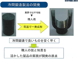 「それなら俺たちがやろう」。立ち上がったのは創業社長が鍛えた腕利きの職人たち。型の形状・作り方、鍛造条件など職人の技と知恵で1977年に冷間鍛造製法を確立させた。