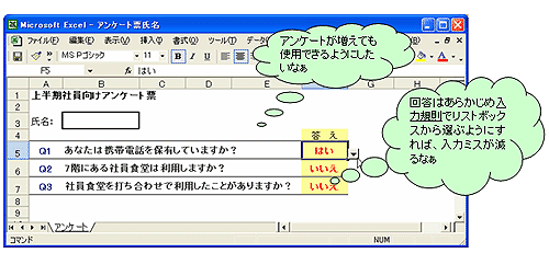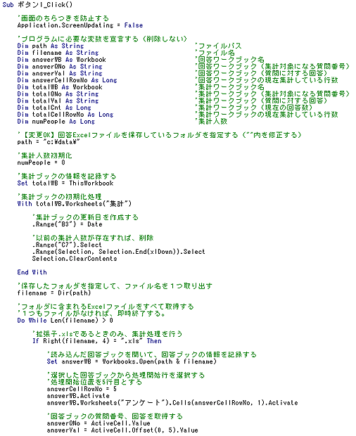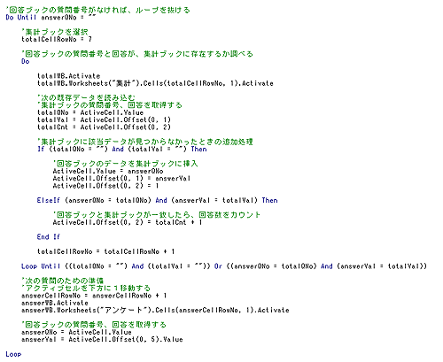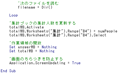 いや、しかし巨大なプログラムを考えてしまったものです。これは、回答ブックと集計ブックを比較する処理をかなり原始的に行っているからです。この方法では、質問数が100近くになるとおそらく数分はExcelが「ガーガー」いっているように忙しく動くことになると思います。質問数が100近くになり、早く計算させたいのであれば、データベースシステムの導入を検討したほうがいいかもしれませんね。