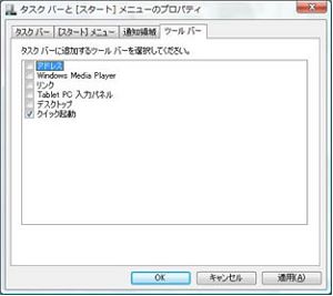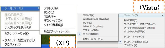 XPのツールバーと比べると、[言語バー]の代わりに[Tablet PC 入力パネル]が入り、[Windows Media Player]が新しく追加できるようになったことがわかります。