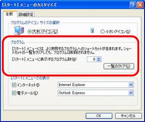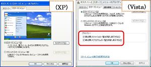 XPも[カスタマイズ]画面にある[プログラム]の項目で表示する数を変更することができますので、最近使ったプログラムを表示しないようにできます。