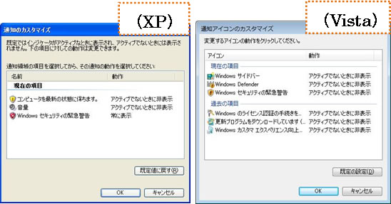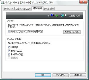 また、XPでは[タスクバー]内にあった[通知領域]はVistaでは独立したタブになっています。