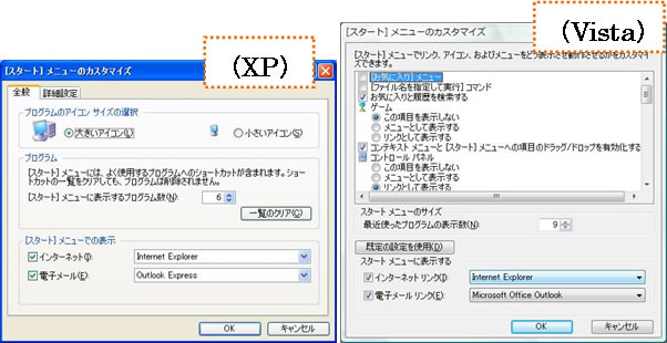 カスタマイズ画面の項目に大きな変化はありませんが、XPがタブで分けているのに対し、Vistaは1つの画面で表示しています。