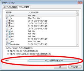 (3)テキストボックスの中に追加したいファイル拡張子を入力し、[新しい拡張子の追加]ボタンを左クリックします。
