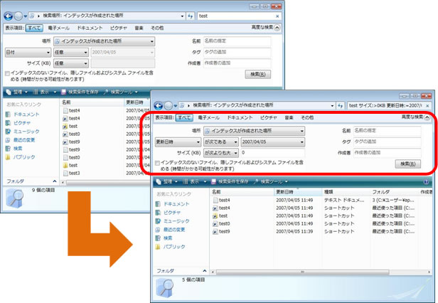 Vistaでは一つの画面でいくつかの条件を同時に設定して絞り込み検索ができます。