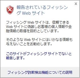 2:[フィッシングサイトの報告サイト]に載っていた場合、サイトの表示がブロックされ、サイトを表示するエリアに警告が表示されます。
