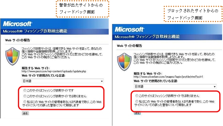 ユーザーは警告の出たサイトがフィッシングサイトかどうかフィードバックできます。