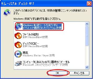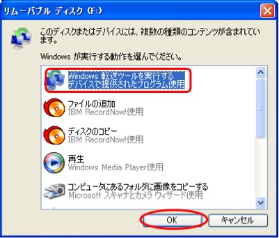 (1) 現在お使いのパソコンに、Windows VistaパソコンでWindows転送ツールをコピーした外付けUSBメモリを接続します。リムーバブルディスクの【Windows 転送ツールを実行する】を選択して、【OK】をクリックします。