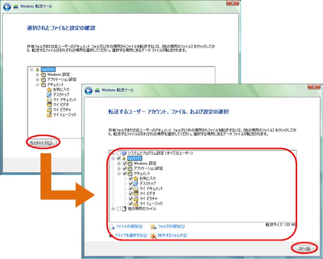 (8)この画面が表示されたら【転送】をクリックか、転送するデータを指定したい場合は、【カスタマイズ】をクリックしてください。