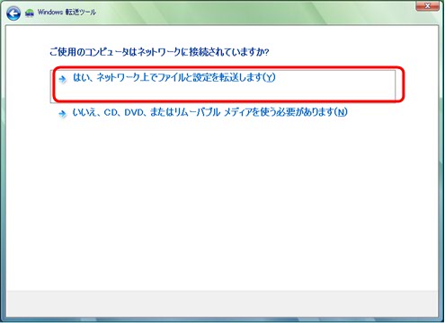 (10)今回はネットワークを使って進めますので、【はい、ネットワーク上でファイルと設定を転送します】をクリックします。
