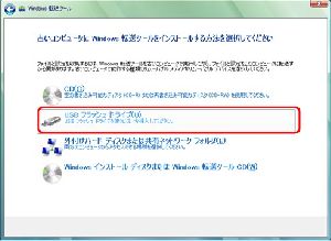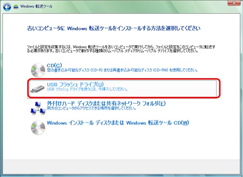 もし、USBメモリがない場合は、【CD】、【外付けハードディスクまたは共有ネットワークフォルダ】、【WindowsインストールディスクまたはWindows転送ツールCD】のいずれかをクリックしてください。