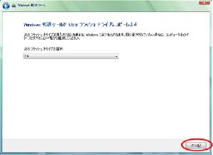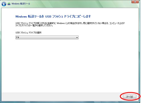 (8)外付けUSBメモリに、実行用のWindows転送ツールをコピーします。コピー先のドライブ番号は、Windows Vistaによって自動的に設定されるので、【次へ】をクリックしてください。