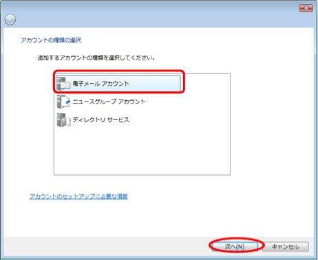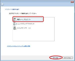 (4)この画面が表示されたら【電子メールアカウント】を選択し【次へ】をクリックします。