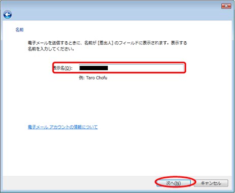 (5)この画面が表示されたら【表示名】欄に名前を入力して【次へ】をクリックしてください。