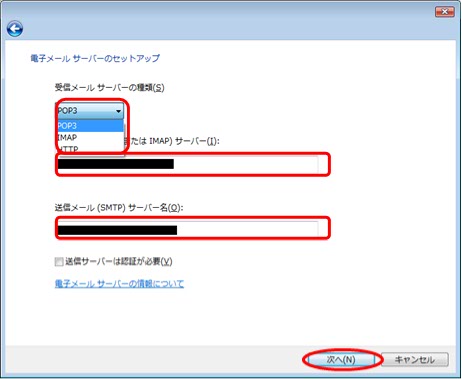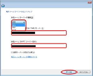 (7)この画面が表示されたら、【受信メールサーバーの種類】を選択し、【受信メールサーバー】、【送信メールサーバー名】をそれぞれ入力し、【次へ】をクリックしてください。