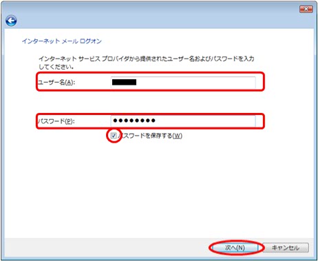 (8)この画面が表示されたら、【ユーザー名(スクリーンネーム)】、【パスワード(ユーザー名に対応したパスワード)】を決め、【次へ】をクリックしてください。【パスワードを保存する】のチェックを外すと、メールを受信するたびにパスワードの入力が要求されます。