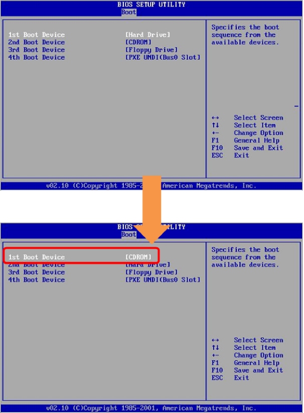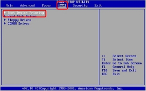 <3>ブート順を[CDROM]、[Hard Drive]の順に並べ変えます。