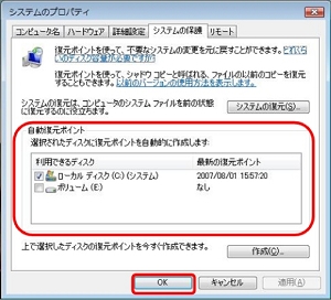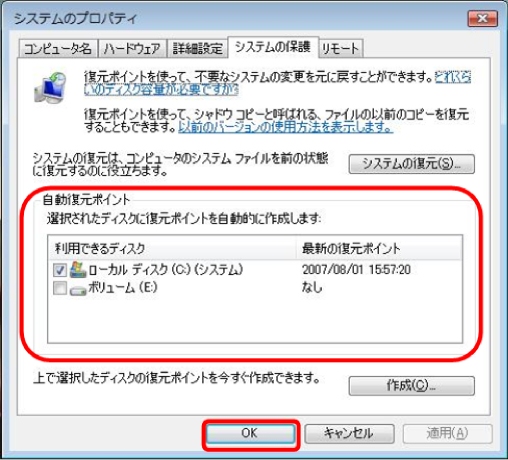 (4)[自動復元ポイント]の一覧に表示されているディスクで、シャドウコピーを作りたいディスクのチェックボックスにチェックを入れ、[OK]ボタンを左クリックします。