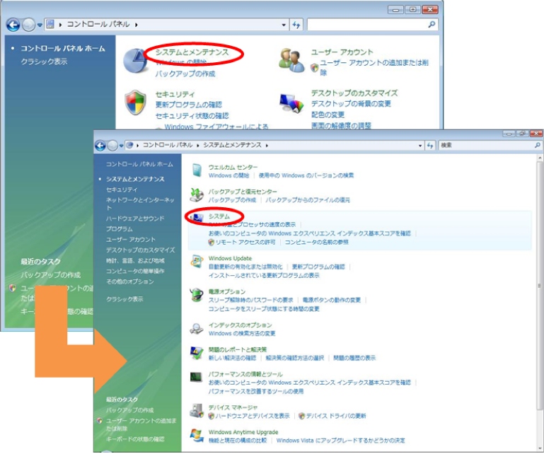 (1)[コントロールパネル]から[システム]画面を表示します。