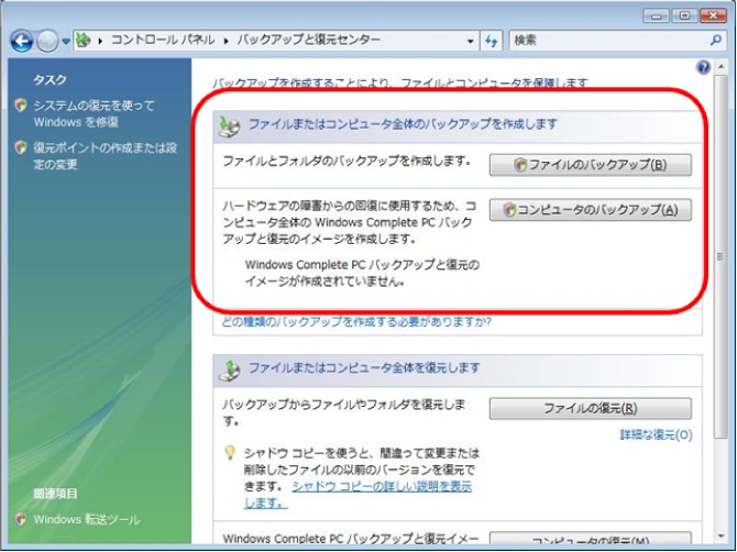 [ファイルのバックアップ]とは別のバックアップ機能ですが、[バックアップと復元センター]がバックアップと復元の機能を一元管理しているため、特に意識することはありません。