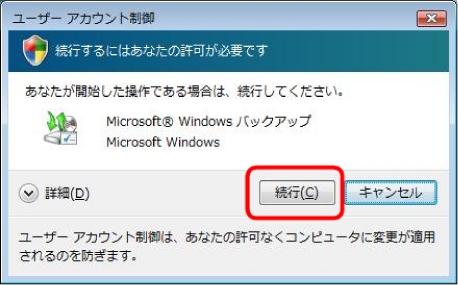 <2>ユーザーアカウント制御機能により、操作続行の許可を求められますので、[続行]ボタンを左クリックして続行の許可を出します。