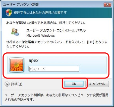 管理者権限を持つユーザーのパスワードを入力し、[OK]ボタンを左クリックすると操作が続行されます。