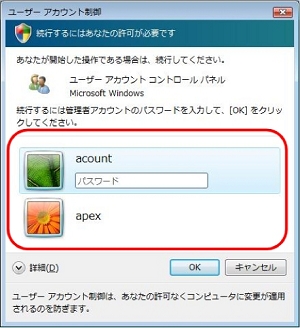 また、管理者権限を持つユーザーが複数存在する場合には、管理者権限を持つユーザーを選んでパスワードを入力します。