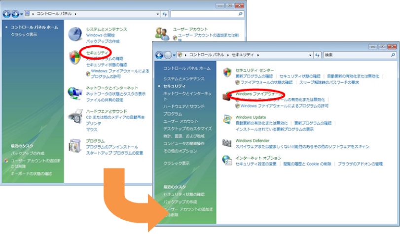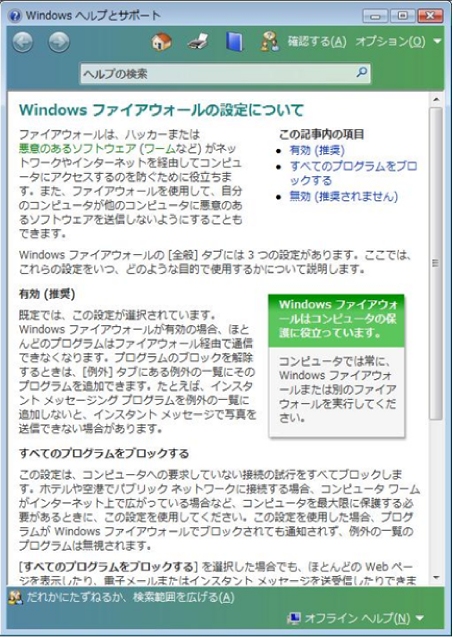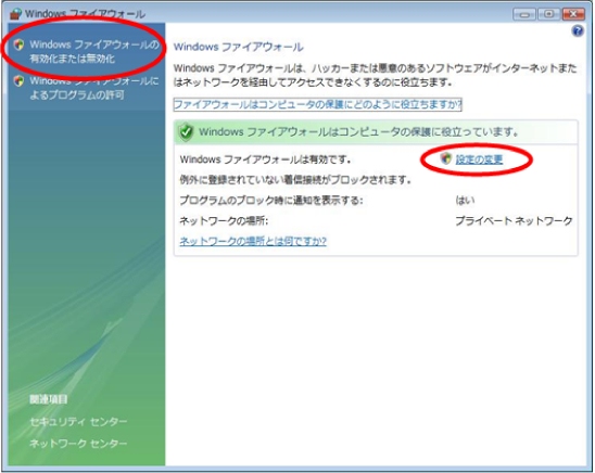 基本設定では有効となっていますが、ファイアウォール機能を持ったセキュリティソフトをインストールした場合など、[Windowsファイアウォール]を無効にしなければならない場合があります。