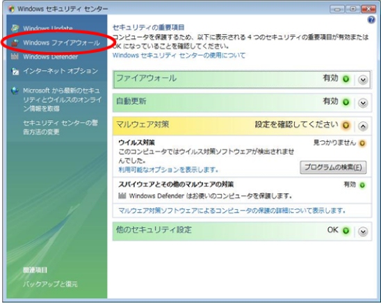 [Windowsセキュリティセンター]から表示する場合は、画面左側の[Windowsファイアウォール]を左クリックします。