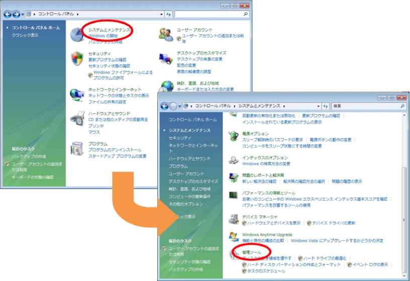 [コントロールパネル]の[システムとメンテナンス]にある[管理ツール]を左クリックします。