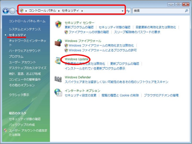 [コントロールパネル]の[セキュリティ]内にある[Windows Update]を左クリックします。